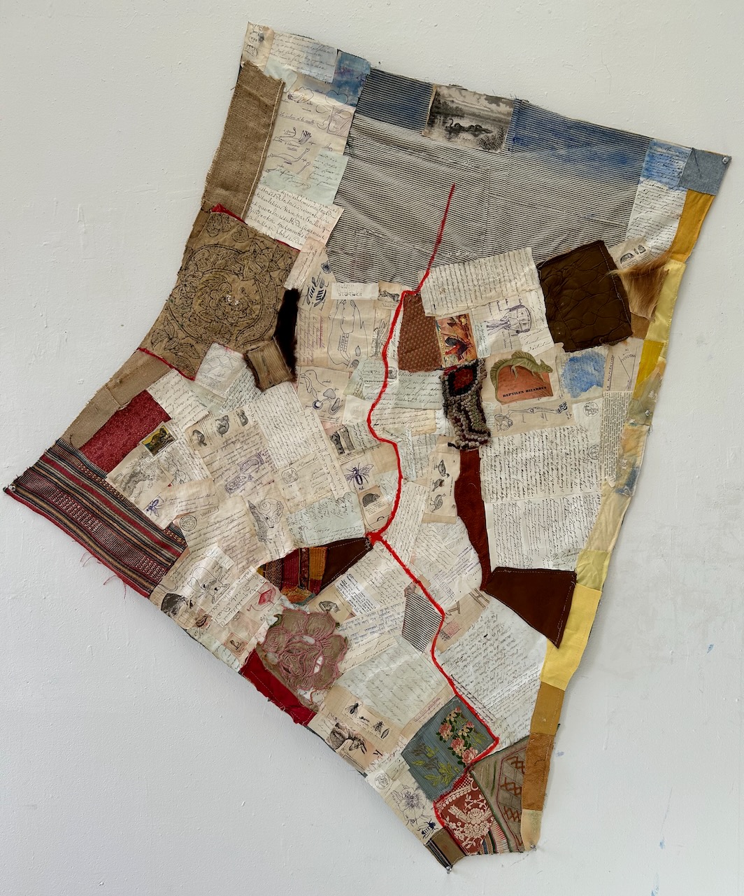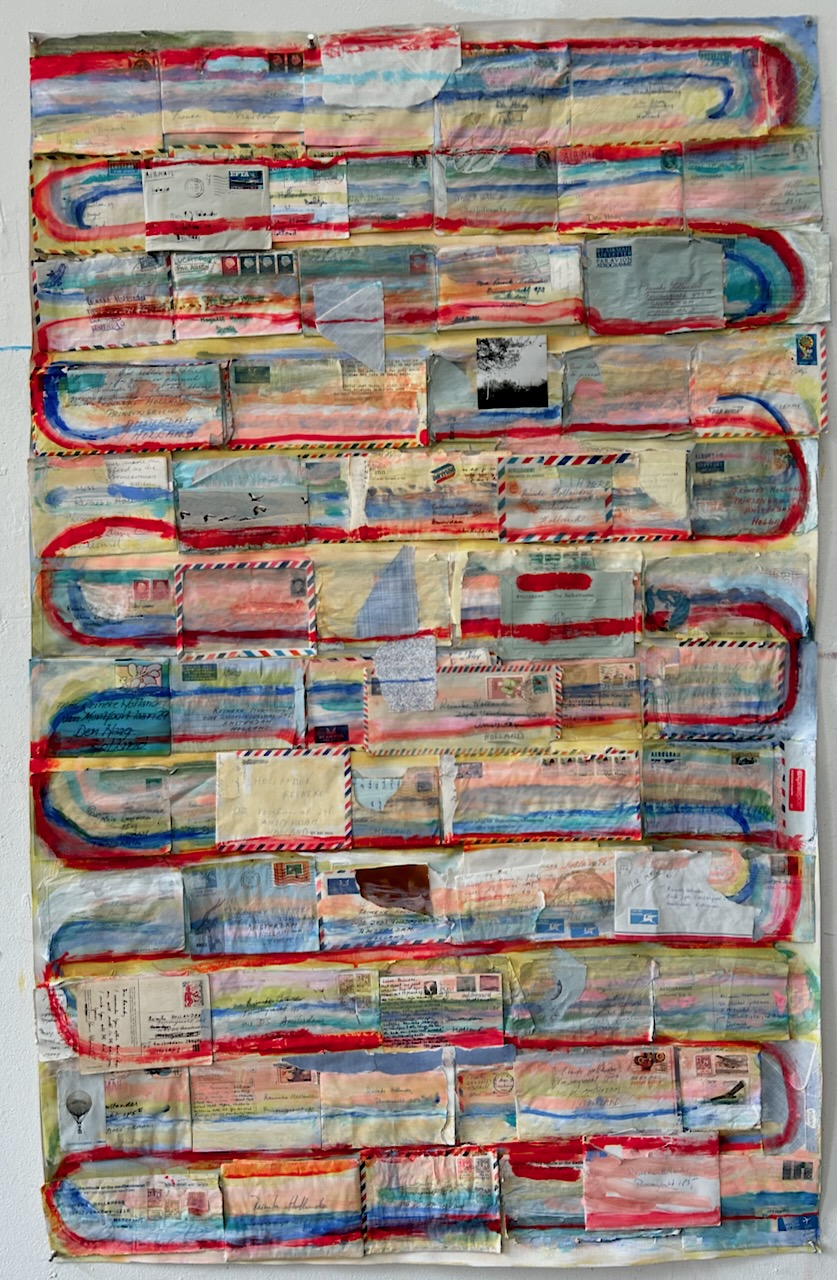 In her mixed-media series she uses next to paint (acrylic or oil) ‘lost and found’ objects and vintage textiles and paper, to rescue their stories and re-animate them in new contexts. Traveling to ‘other places’ is another source of her inspiration. She has thus attended residencies or established studios for lengthy periods in far-flung locations, including Tanzania, Israel, Poland, New Mexico and most recently Marseille. Every one of her works is formed by a hybrid of all these places: their political, historical, cultural and emotional vibes that flow into her studio where they are coupled with material, often found locally.
